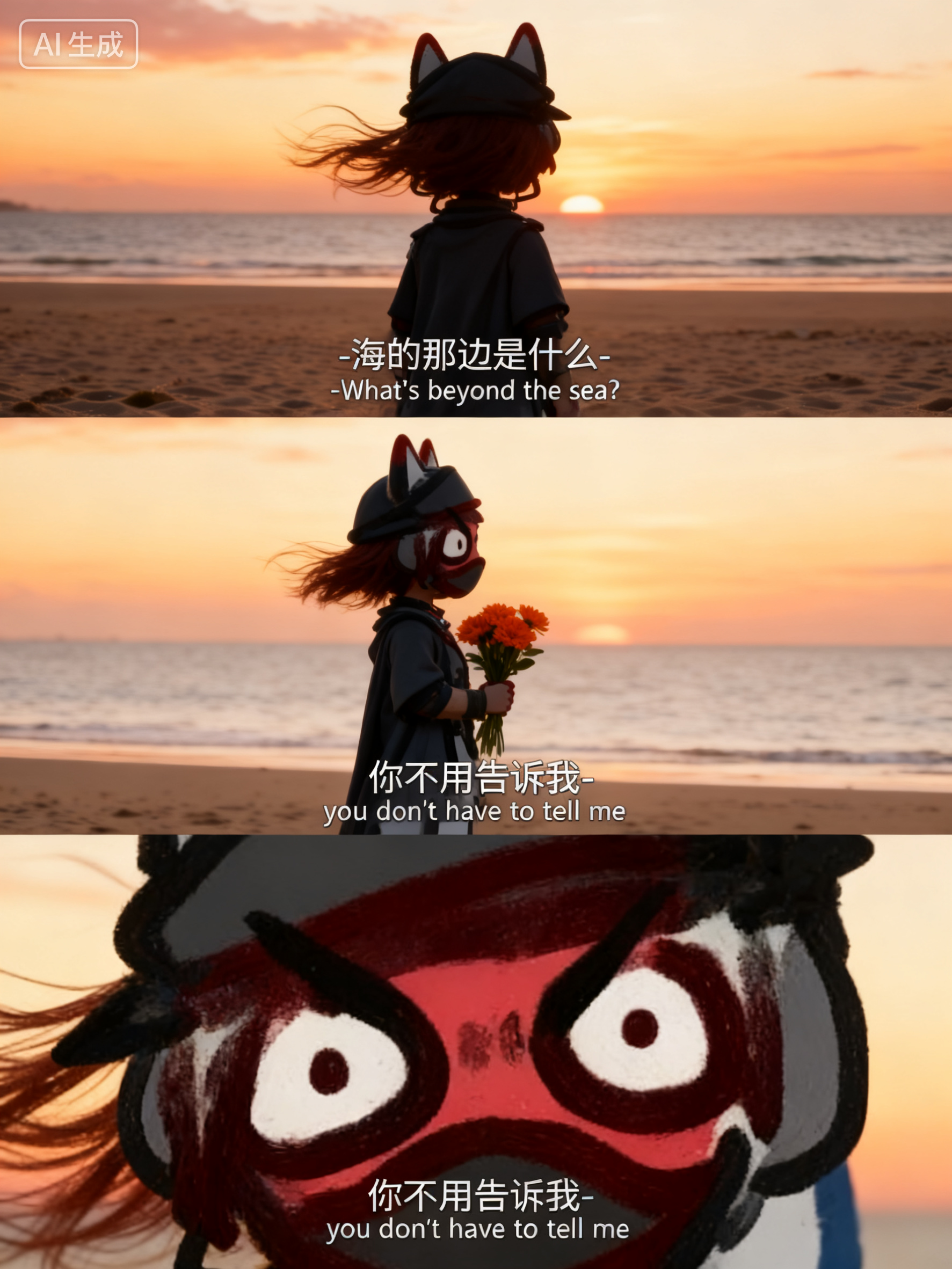 无言 以图片游戏人物为基础,生成一张三拼图格式的艺术感写真图,每张图固定比例3:4海边写真图,场景为海边沙滩,天空呈现夕阳晚霞,海面平静。画面中有人物和参考图一致,上部第一张为近景,站在沙滩上的背影,头发被风吹起,添加中英字幕“海的那边是什么-What's beyond the sea?”,中部第二张是手持橙色花束,侧身站立于海边,添加中英字幕“你不用告诉我-you don't have to tell me”;下部第三张是面部特写,头发随风飘动