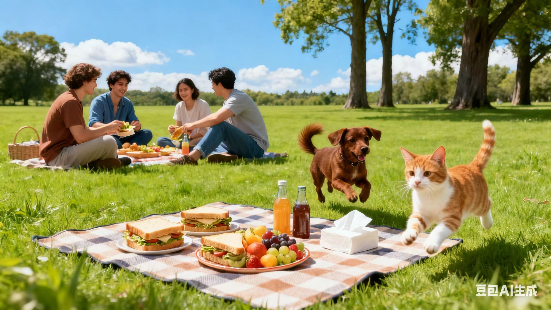 呜呼~ 步骤 1:明确需求。确定图片主题、风格、等关键要素生成一张在一片草地上,人们野餐,小狗小猫蹦蹦跳跳的图片 步骤 2:输入提示词。将需求转化为详细文字描述,包括主体、场景,越精准生成效果越好。 步骤 3:模型生成。AI 根据提示语通过算法计算生成初步图片,过程需几秒到几分钟。