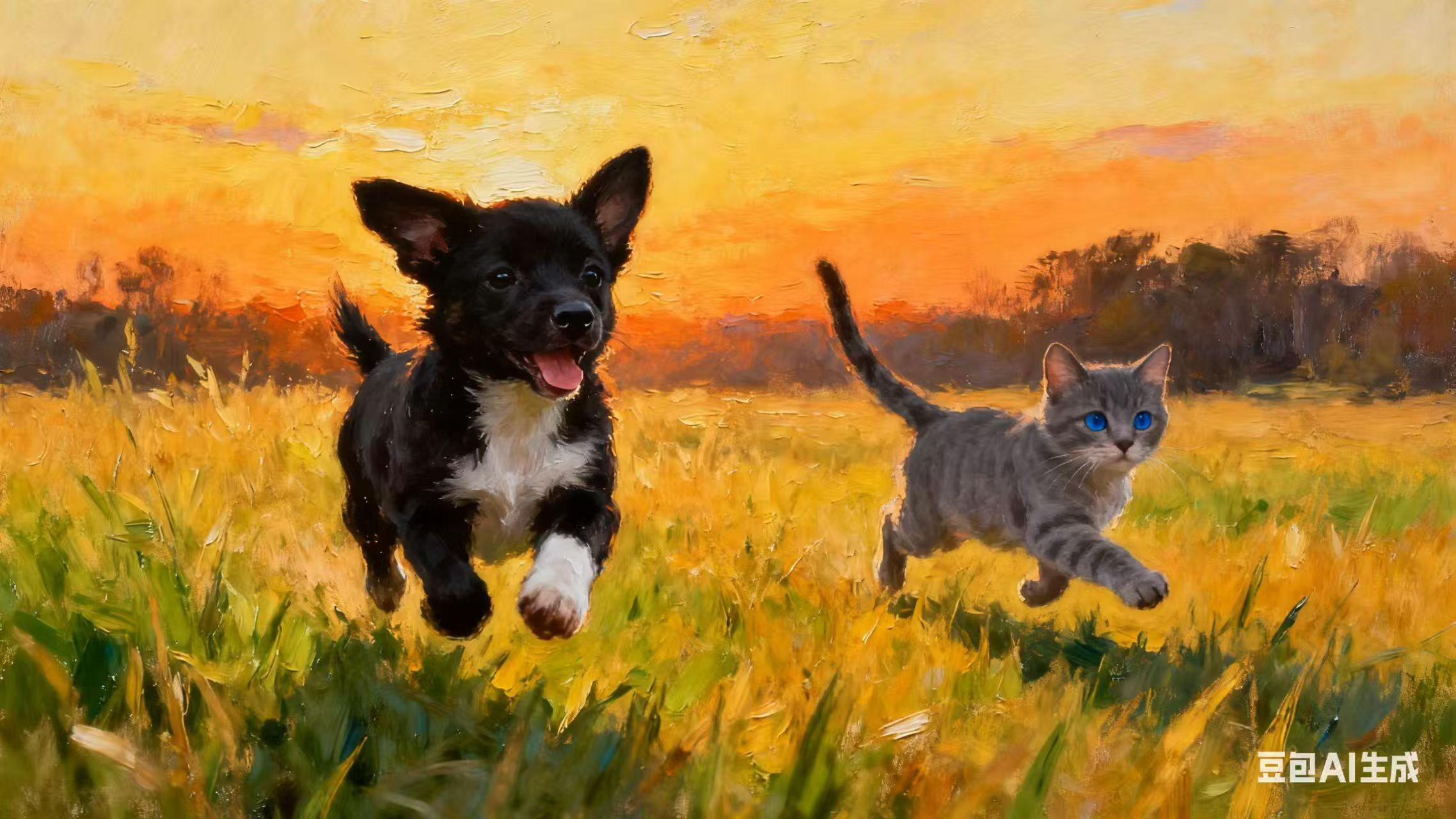Lyq 1. 需求分析:用户要求生成"阳光下小狗小猫在广阔草地上奔跑"的画面 2. 提示词优化:系统自动将基础描述细化为更具体的提示词,包括: 主体:小狗、小猫(品种特征) 场景:广阔草地、阳光下 动作:奔跑 风格:油画质感 3. 模型选择:使用适合动物和自然场景的生成模型 4. 图像生成:AI根据提示词逐步构建画面 先创建草地和天空的基础构图 再添加小狗和小猫的形象及动态 最后渲染光影效果和油画质感 5. 细节优化:自动修正可能的瑕疵,如比例问题、光影不一致等 6. 结果输出:生成最终图像并添加水印