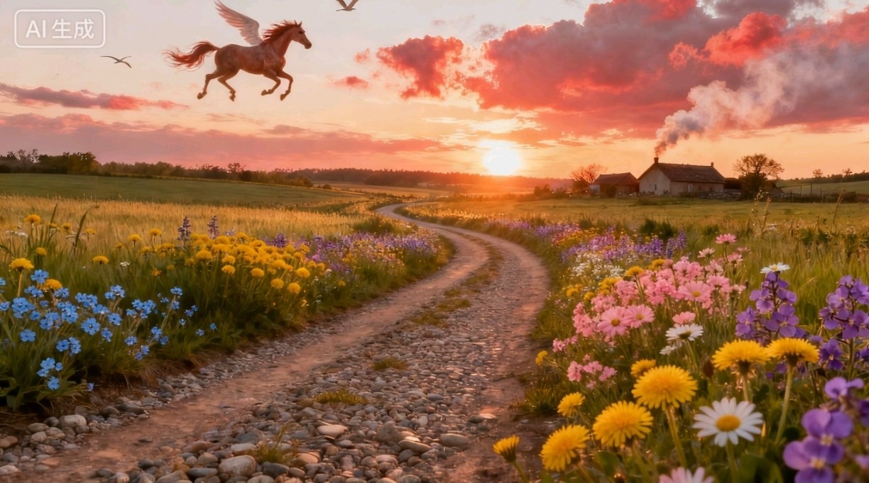 生成一张图片,图中在一条蜿蜒的乡间小路上,地面铺满了细碎的石子,散发着质朴的气息。小路的两旁开满了五彩斑斓的小花,有娇小的蓝色勿忘我,有明艳的黄色蒲公英,有粉嫩的雏菊,还有淡紫的二月兰。